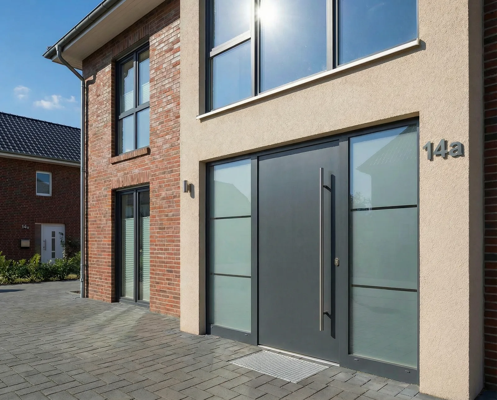Wir realisieren raumhohe Türen bis 3 Meter Höhe, Seitenteile aus Glas und integrierte Briefkastenanlagen für moderne Entrees.