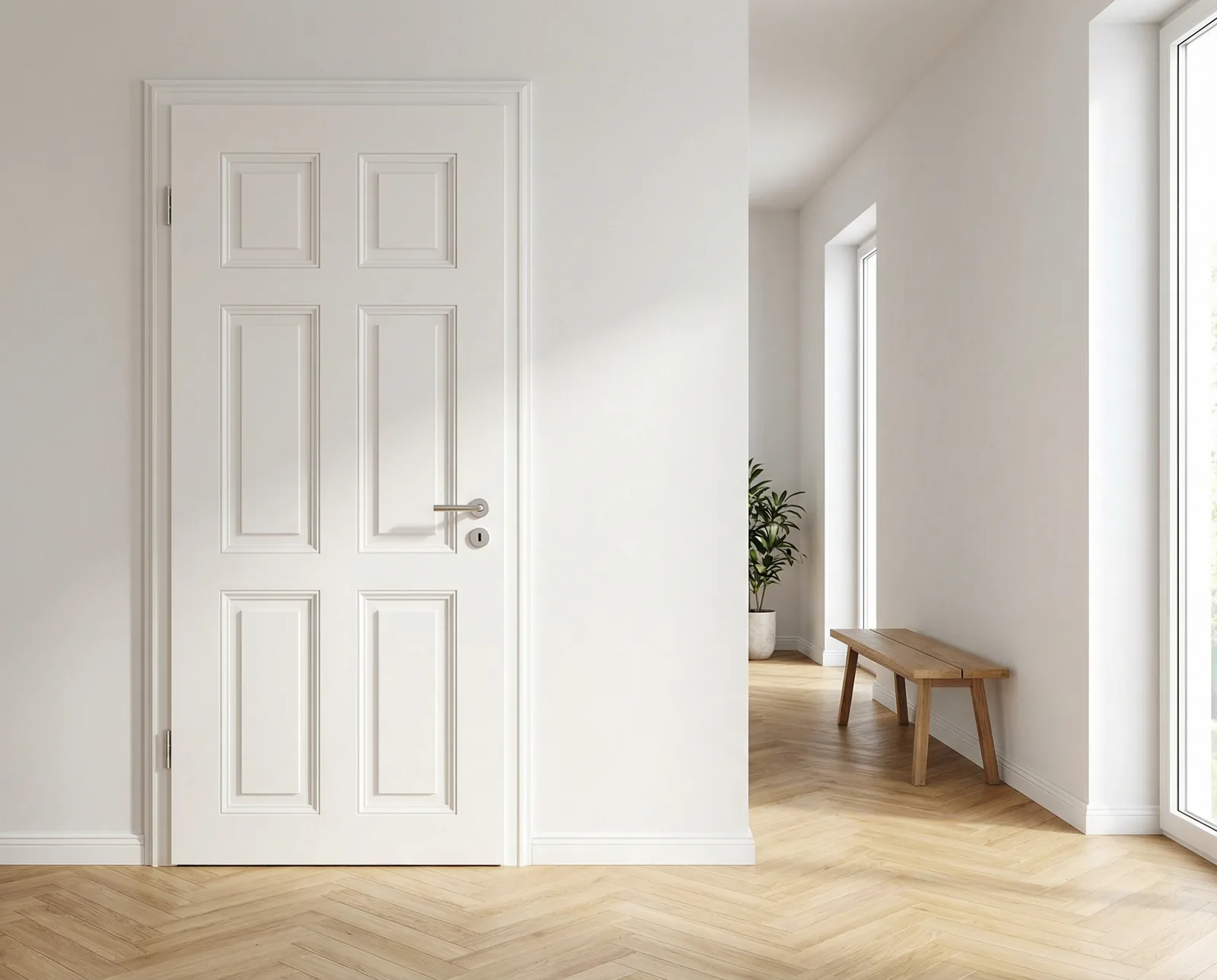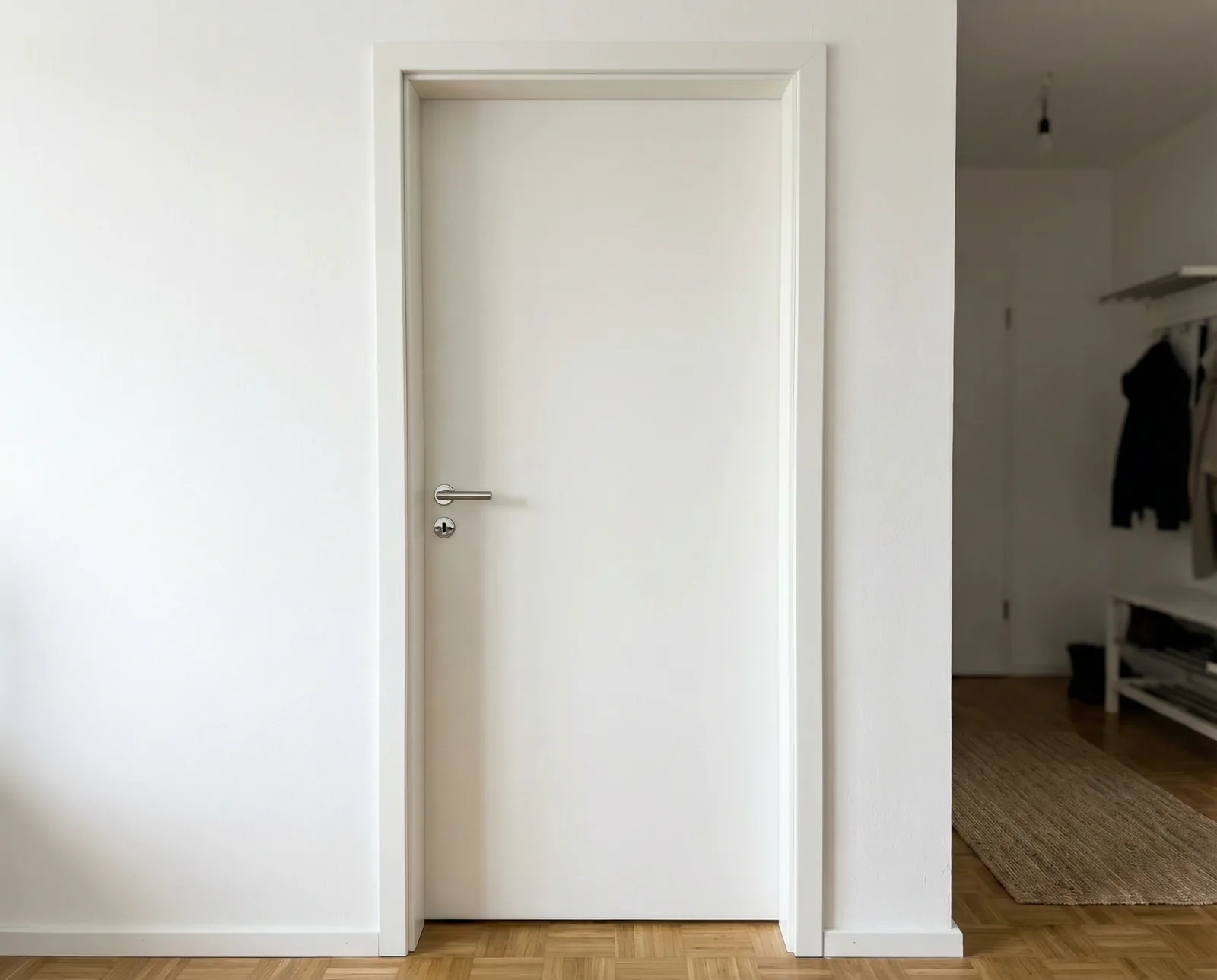 Das Türblatt bildet eine Ebene mit der Zarge. Verdeckte Bänder sorgen für moderne, minimalistische Optik im Neubau.